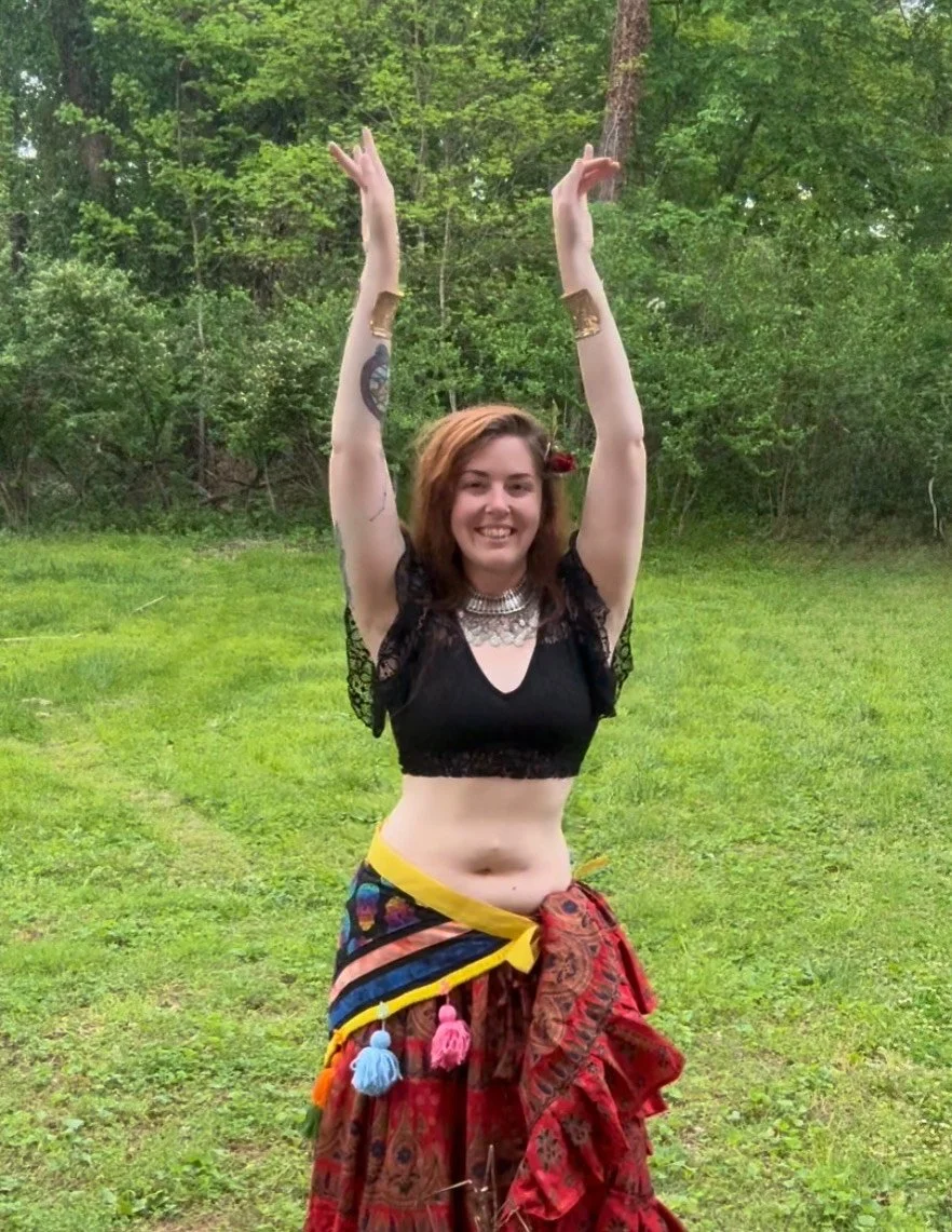 My name is Misty. I’ve been dancing since 2019, but my belly dance journey started many years prior when I was in college. I saw a troupe performing at a Renaissance festival one sunny fall day, and I marveled at their grace, confidence, and diversity of body types. Ever since then, I’d always wanted to learn but never had the courage to try.