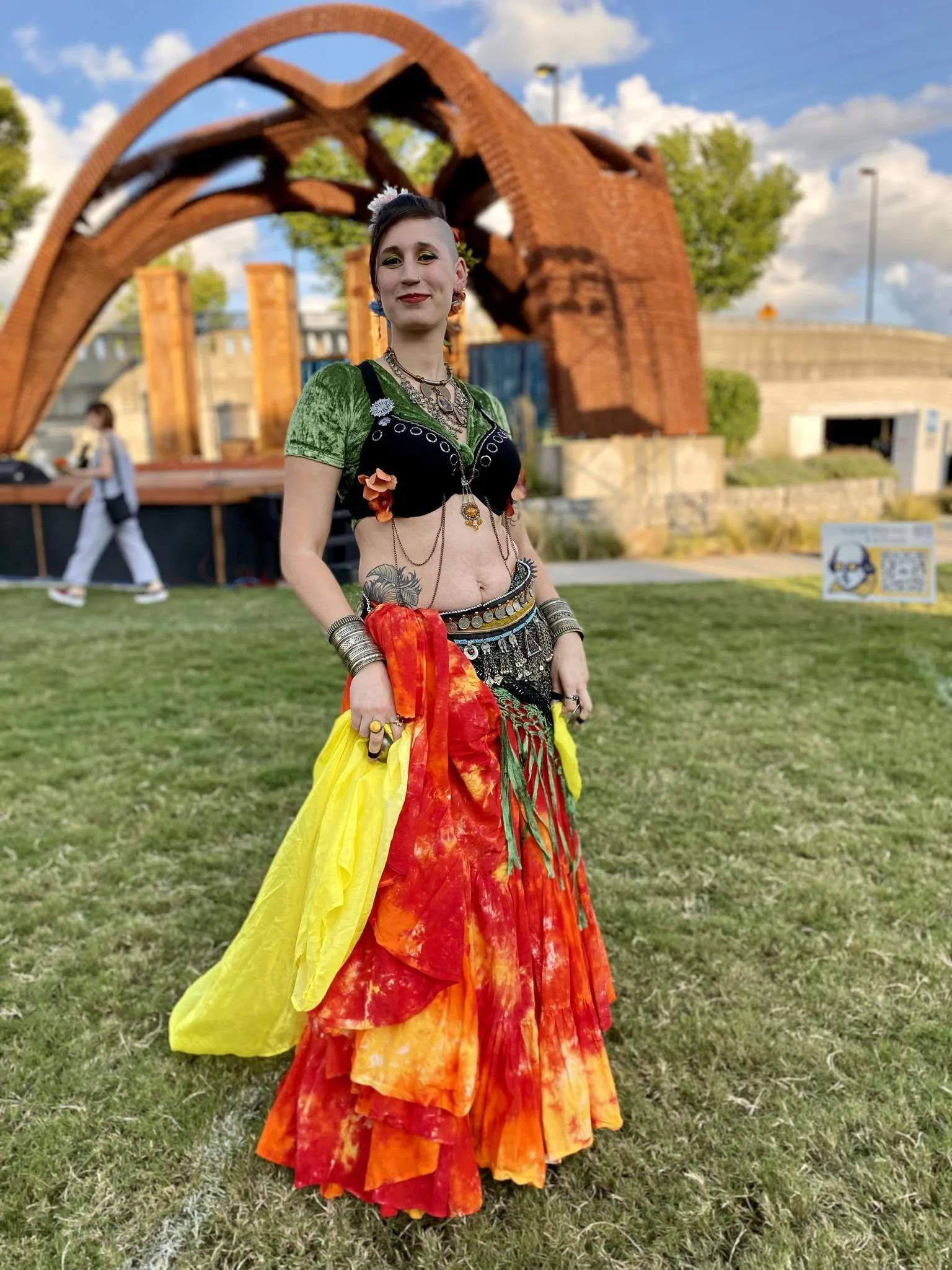 I also remember the first time I saw Fire Phoenix perform. It was during a period of seismic changes in my life, and I was trying to find my footing in a new city. I'd been a long-time admirer of Fat Chance Belly Dance--in fact, one of my Halloween costumes was an homage to their aesthetic. Seeing Fire Phoenix rekindled my admiration, and in January 2024, I finally gathered the courage to attend my first Level 1 class. It’s been an incredible journey ever since. From McKenna, Teresa, Morgan and my fellow dancers, I have learned poise, confidence, gratitude, and above all, community. I revel in the collective energy that happens when we improvise in sync. Best of all, I’m learning to be kinder to my body in all its phases, and I'm amazed at how much stronger it has become.