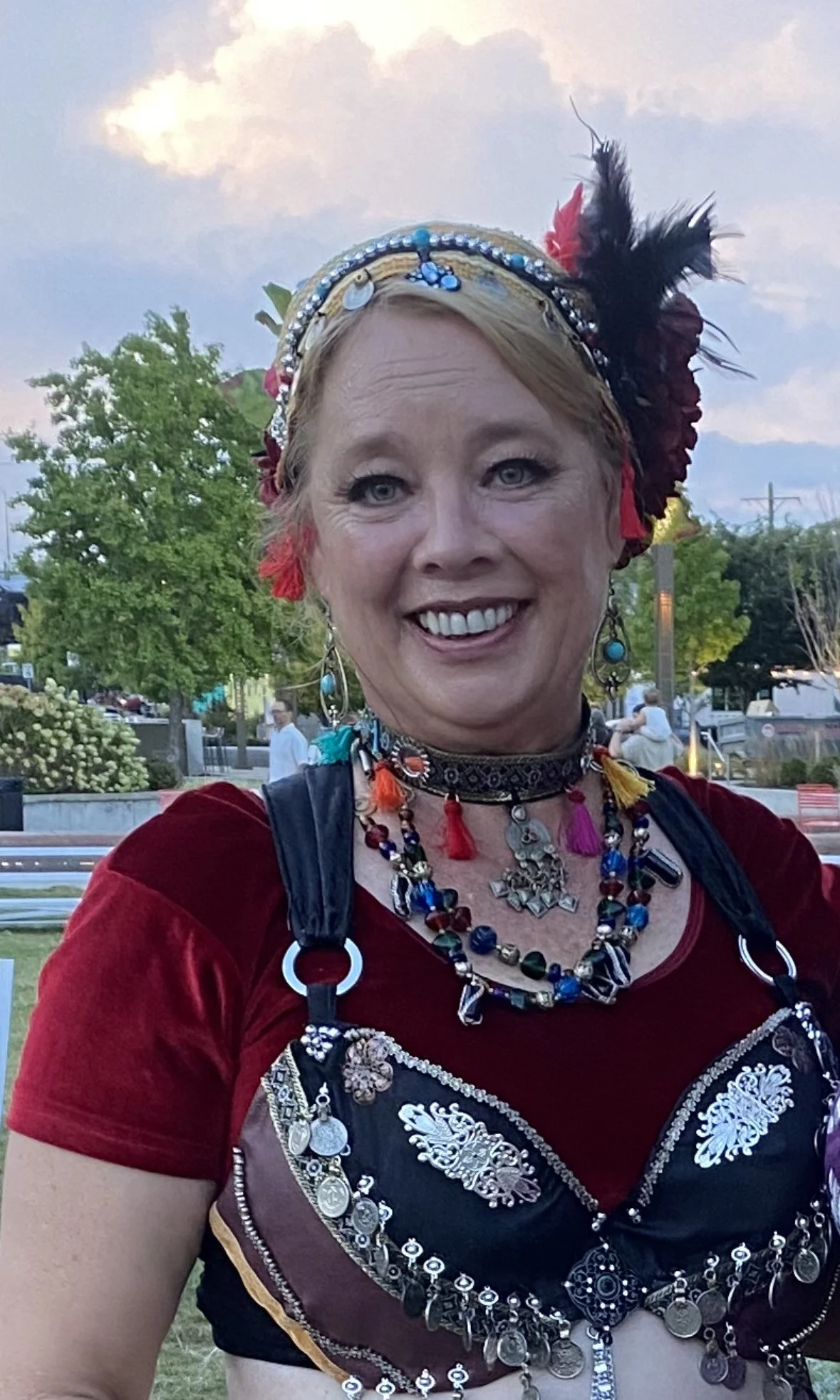 I moved to Nashville in 2007 with my dogs to find a new and exciting life after a divorce. I have 3 dogs and volunteer at the shelter fostering puppies. In my spare time I love to garden, quilt, crochet and paint. In 2021 my friend invited me to take level 1 belly dancing class with her through Fire Phoenix Belly Dance. I had no experience in any kind of dance, so this was very new to me. I like to think of myself as a creative person, but most of what I do are solo projects, so group dancing was pretty far outside of my comfort level. I am so glad I got the opportunity to learn this dance style. Not only did I finally learn how to dance, but it's changed my outlook on so many other things. This style of dance may be the only experience I have, but it is so empowering. I have learned to believe in myself with the help of the lovely ladies of Fire Phoenix. There were times I thought I couldn't do it, but sticking with it and doing hard things feels so good when you finally figure it out. It's so fun to get all dressed up and dance this style, it's never the same and always so much fun! I can't wait to see how my journey continues.